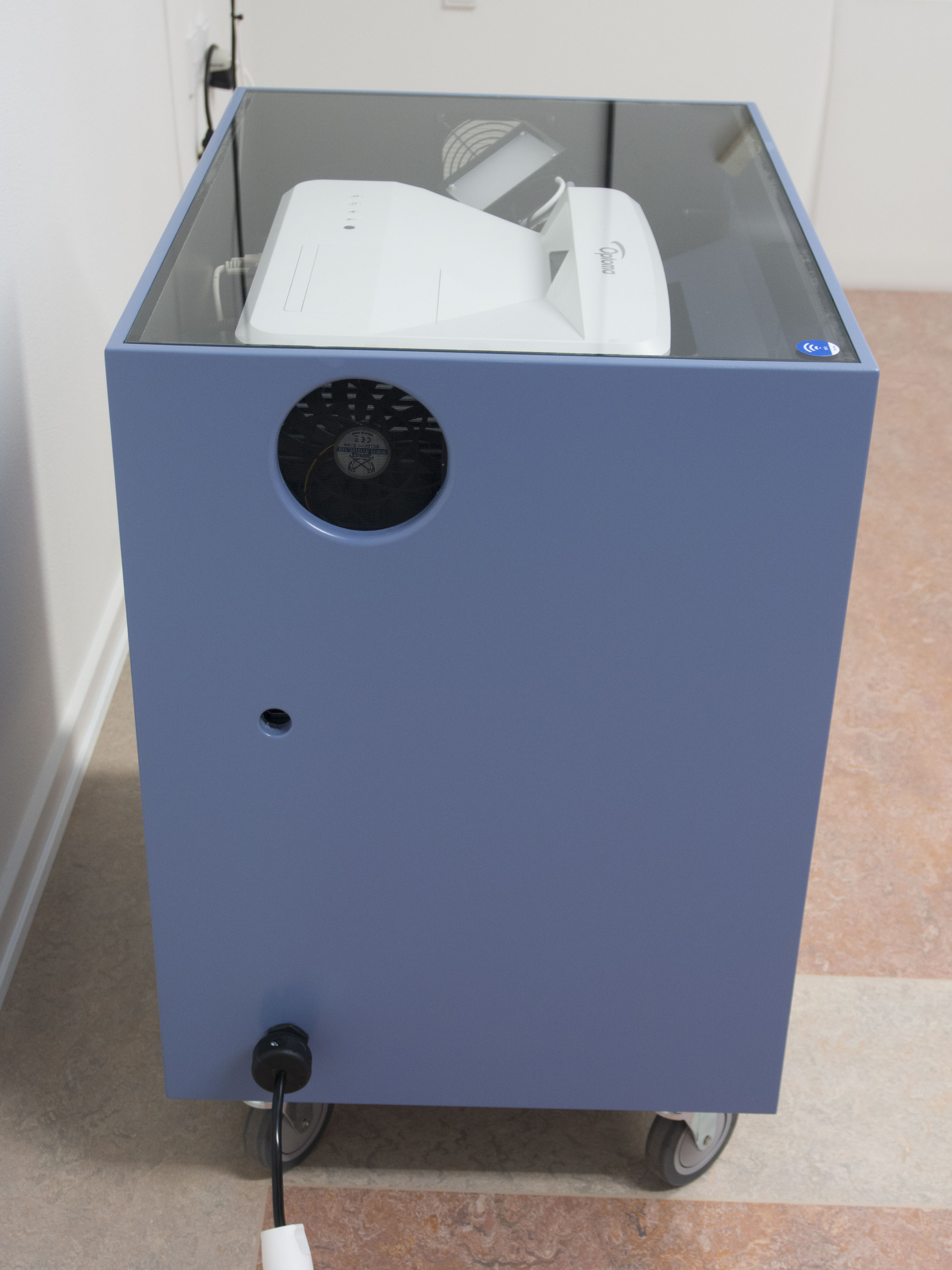 Moto Muto’s Mobile Sansevogn kan på en en vægafstand mellem 0 og 50 cm projicere sansefilm i et ønsket format op til 200″. Vognen kommer med låsbare hjul, låge med nøgle- og tryklås samt kabeloprul med træklås. Desuden står både projektor, højtaler og wall-washer solidt og godt beskyttet i vognen.